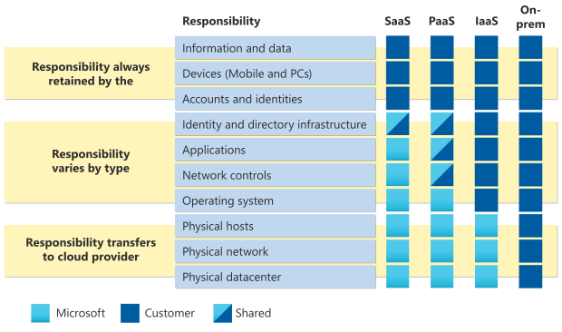 Figure 2 illustrates Microsoft’s shared responsibility model, including areas of responsibility between the customer and Microsoft for workloads running on-premise and in the cloud.